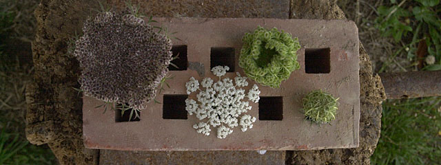 Ces briques étaient disposées en des points singuliers : sur un billot de bois, sur un boisseau de cheminée, sur un bloc de granite, dans l'embrasure d'une fenêtre... Ces plantes n'ont pas été renouvelées pendant l'exposition. Certaines ont séché en conservant leurs couleurs, d'autres se sont fanées, d'autres enfin ont fructifié et le vent a dispersé leurs akènes.