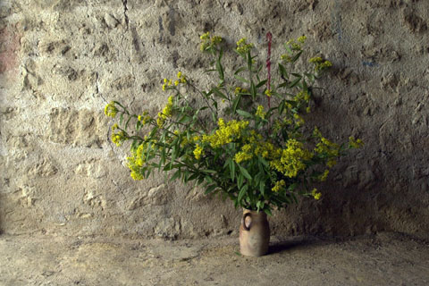 A l'entrée, un vieux pot à lait en grès contenait un gros bouquet de séneçons (Senecio nemorensis fuchsii), une plante caractéristique des talus forestiers du Morvan en été. |