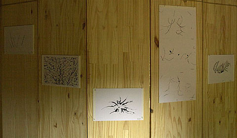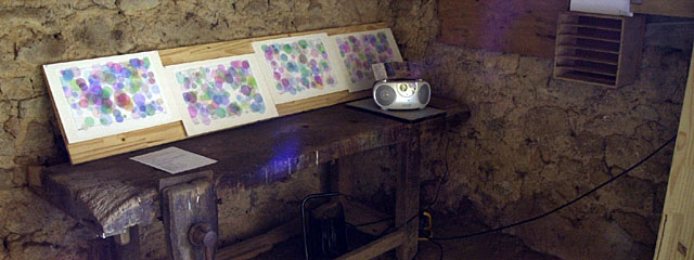En entrant, sur la droite, un ancien établi accueillait "random_6", une série de 4 infographies générées par un programme informatique ainsi qu'un lecteur de CD-audio diffusant des chants d'oiseaux enregistrés dans les forêts avoisinantes.