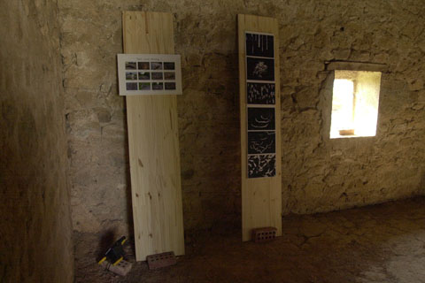 Dans le coin gauche au fond de l'appenti, deux panneaux de pin de 400mm x 2000mm acueillaient "l'année sauvage" et "Extractions_0". |