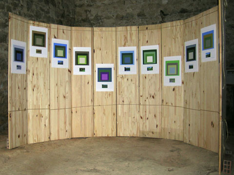 Le centre de l'espace était occupé par un assemblage semi-cylindrique de 12 panneaux en pin de 400mm x 2000mm reliés entre eux par des cordelettes de chanvre. L'intérieur du demi-cylindre accueillait "Hommages au carré". |