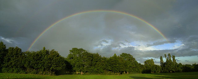 Ces photos ont été prises en Bresse, près de Cuisery, en août 2000, au coucher du soleil, après un orage, lors d'un séjour de découverte de la nature organisé par le Centre Eden. L'arc en ciel est un montage de trois photos prises avec un objectif de 28mm ; le détail a été photographié avec un objectif de 300mm. |